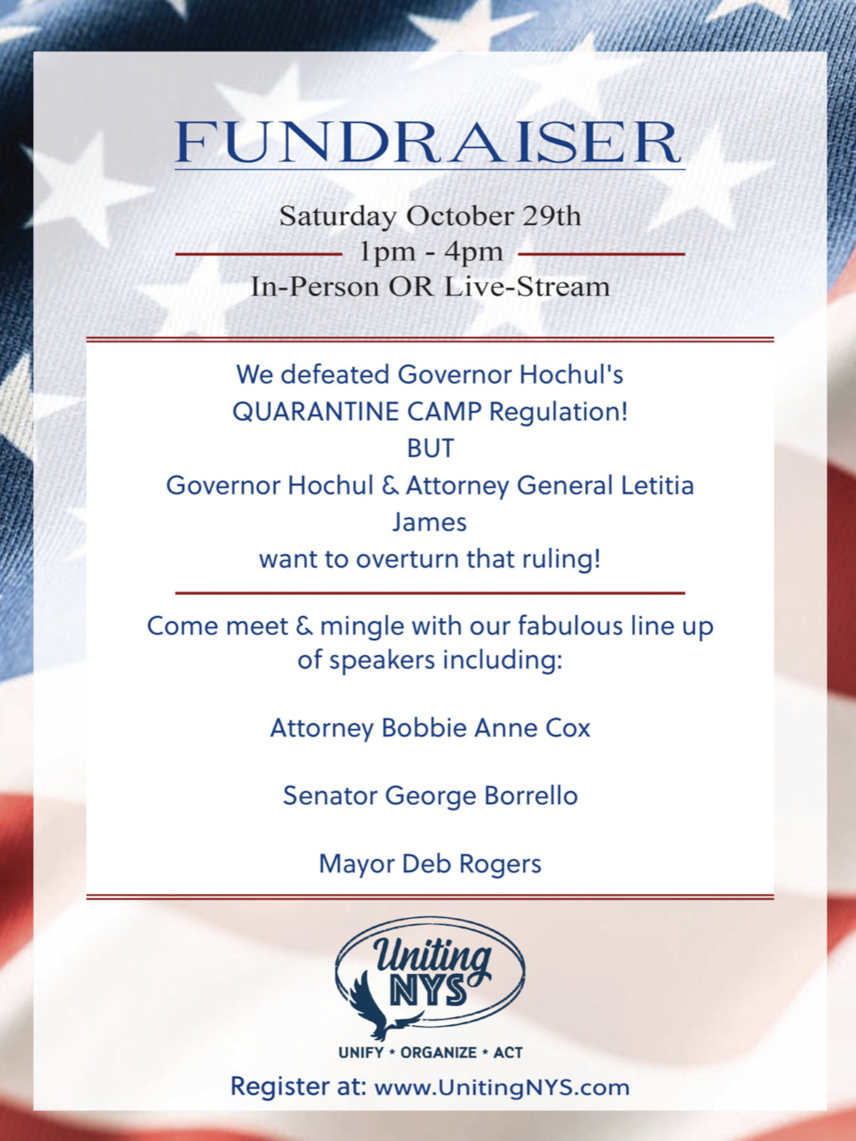 If you are in Western New York, then come in person. Meet our awesome attorney, Bobbie Anne Cox, hear about what our next lawsuit might look like, get details about our historic quarantine case, meet our co-plaintiff Senator George Borrello, bid on auction items, and more.