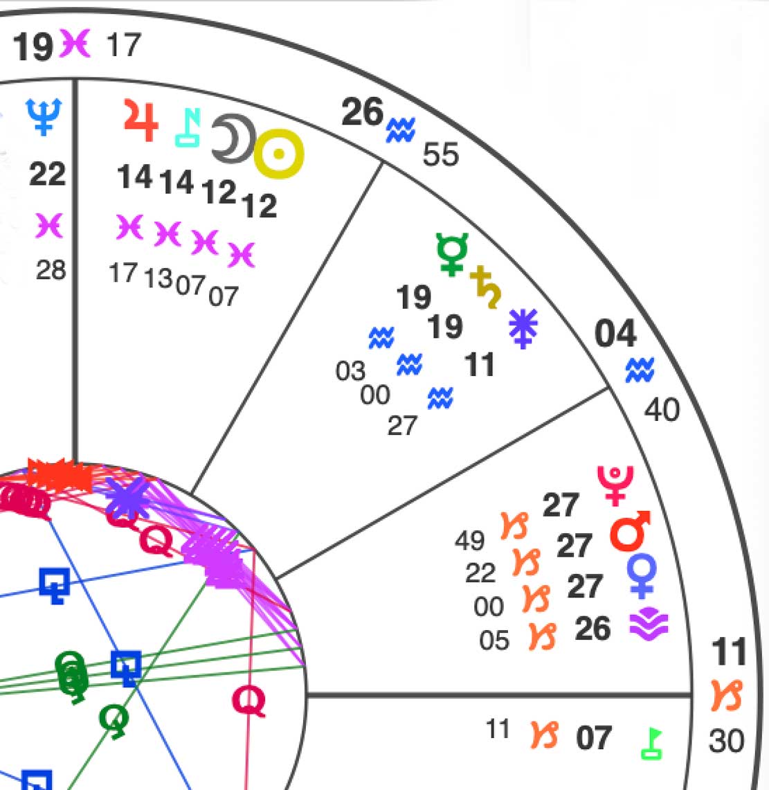 This chart shows four different partile conjunctions happening simultaneously: Moon conjunct Sun (the New Moon in Pisces), Mercury conjunct Saturn (in Aquarius), a rare event, Jupiter conjunct Nessus (in Pisces), and a completely unique event, the quadruple conjunction of Venus, Mars, Vesta and Pluto (in Capricorn). In the following few days, two others happen: Sun conjunct Nessus (in Pisces), then Sun conjunct Jupiter (in Pisces).