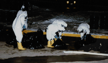 Photo above shows hazardous materials workers filling 500 barrels with contaminated water, ice and sand after water mains were allowed to freeze and burst in the PCB and dioxin-tainted Parker Theater, State University of New York at New Paltz, January 1992. Photo by Student Leader News Service.