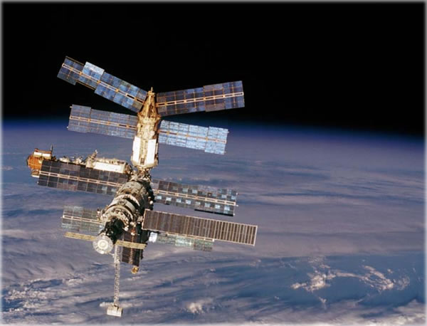 ![]() This image was taken during the Space Shuttle mission 76 in 1996. Backdropped against an array of clouds over the South Pacific Ocean and the Tasman Sea, Russia's Mir Space Station is seen from the Space Shuttle Atlantis. The two spacecraft were in the process of making their third docking in Earth-orbit. Image Credit: NASA.